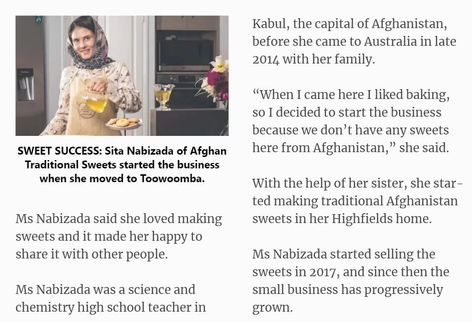 Moving from Afghanistan to Australia in 2015, founder Sita Nabizada quickly noticed a gap in the community for authentic Afghan cultural foods. With a deep love for baking and a spark of entrepreneurship, Sita launched Afghan Traditional Sweets in late 2017 with just a small marquee, a table, and a few homemade treats. Nearly six years on, Afghan Traditional Sweets has become a well-loved name across Queensland, thanks to the support of our amazing customers.